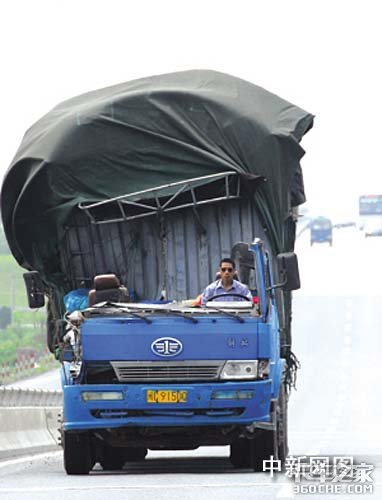在7月25日下午,记者在浙江省杭州市采访途中发现非常雷人的一幕:104国道瓶窑段,一辆闽C牌照的大货车,满载货物急速行驶着,但是仔细一看,这辆货车的驾驶室却是“敞篷”的。这样的景象令人叹为观止。