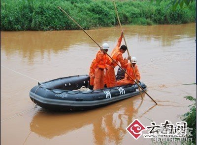由于连日强降雨,盘龙河内水位猛涨,水流湍急,无法立刻确认车辆坠入河底的位置,中队官兵根据现场情况,决定使用冲锋舟救援,4名水性较好的战士下水摸索车辆的具体位置。