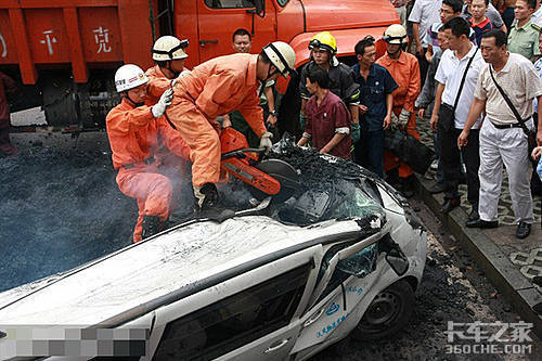 货车扶正后,小面包的左侧被压得严重变形,车门无法打开,抢救员们只能拿电锯把左侧的车框锯开。群众们虽然焦急,但是也都只能无能为力的在一旁默默给抢救员打气。