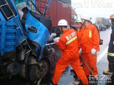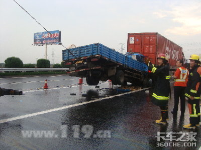 到场时,消防队员看到发生相撞的是一辆大货车与一辆集装箱卡车,事故原因主要是雨天道路湿滑,后方大货车与前车没有保持安全车距,不能采取紧急制动,才导致了这起交通事故。