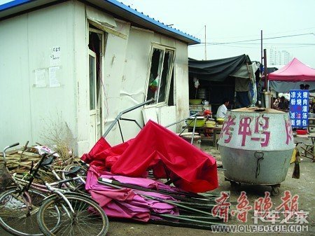 8月6日上午,记者赶到段店东街附近的事发现场时,厢式货车已经开走,但事发店铺的门窗损毁情况依旧清晰可见,板房的玻璃都已经破碎,门也被撞坏凹了进去。店铺的门虚掩着,室内物品杂乱不堪。店铺门前立着一个烤鸭炉子,有被撞击的痕迹。