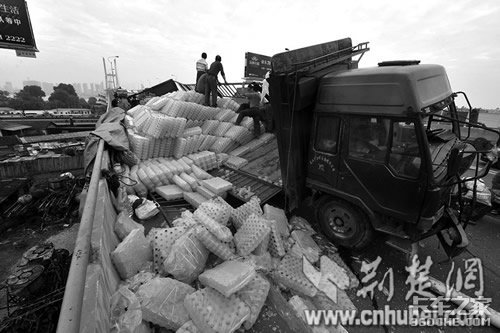 与此同时,现场民警还开始联系车辆和人员,对肇事货车上的货物进行转运。不过,因事发突然,凌晨很多人尚在休息中,联系转运车辆、搬运工人、吊车等不容易,直到凌晨6点多钟,民警才联系到5辆货车和江岸货厂的10名搬运工人赶到现场,进行转运等工作,致使整个的施救过程长达4小时。