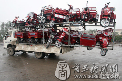 市交警二大队七中队中队长孙红旗带领民警巡逻至平原路与阏伯路交叉口时发现,一辆满载新电动三轮车的白色轻型卡车和一辆蓝色中型厢式货车停在路旁,两车车身都有不同程度的刮蹭痕迹,其中轻型卡车上的电动三轮车过半损坏。民警注意到,轻型卡车超宽也超长,车厢原长3.8米,经车主用钢管做支架改装后长度增加到6米,上下两层共装了16辆电动三轮车(如图)。