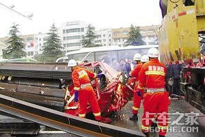 交警先调来吊机,将压在驾驶室上的几捆角钢吊离,清理出营救的作业现场。负责营救的消防官兵立即动用切割机,将驾驶室割开一条缝检查,发现司机已当场死亡,而副驾驶上的一名男子仍然能讲话。经过3个小时的艰难工作,至晚上7点30分,被困伤者终于被抬出驾驶室。伤者双眼紧闭,表情相当痛苦,可能受的内伤不轻,并很快被送往附近医院急救。