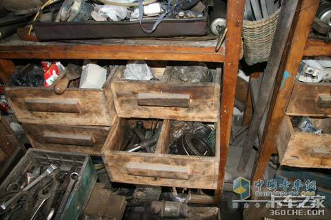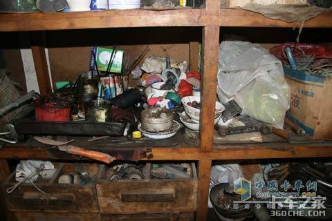 这是一个七八平米的小房间,房间里摆满了各种老旧的工具和配件,各种扳手、千斤顶、管线、润滑油、垫子、轴承、螺丝等等,油漆自己刷,油品成桶买,加注自己来。还有很多古董式的叫不上名儿的老配件在别处已经看不到了,这里活脱脱一个小型的汽车维修店,都是为这辆车准备的。彦师傅说,车型太老了,配件很难找到,对于容易坏的配件,遇到了一般会多备几件。即便如此,为寻找有些配件费了不少功夫。