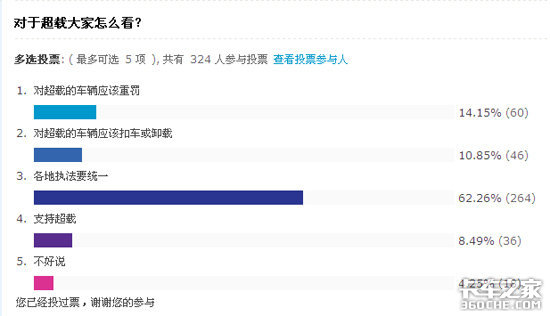 从大家对超载的看法来看,63%的网友投票给了“各地执法标准要统一”这一选项,从网友回帖的讨论中可以看出,大家对于治理超载的几个部门有着较大的意见。