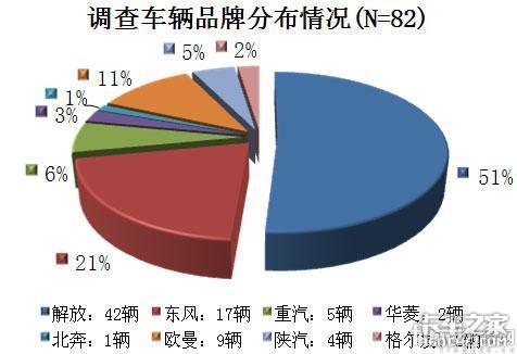 本次问卷调查共涉及卡车110辆,其中有效问卷涉及车辆82辆,被调查车辆品牌分布如图1-1。因为调查的三个地方中北京和沈阳是北方城市,且牵引车居多,所以雄踞北方多年的解放卡车占一半比例。