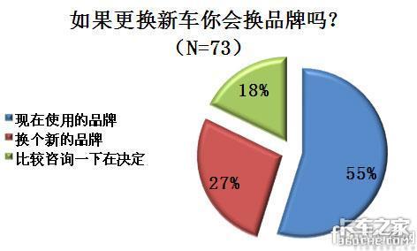在更换新车是否会换新的品牌这个问题上,一共有73名司机给出了自己的选择,其中40名自己表示即使更换新车,也会购买正在使用的品牌,超过调查人数的一半;有20个人在更换新车的时候会选择换新品牌,占了调查人数的27%;只有13个人觉得在更换新车的时候要比较咨询一下再做决定。具体如图3-1所示。