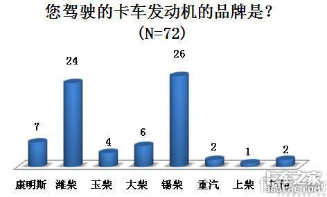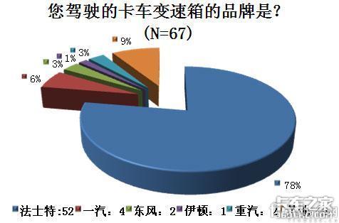 在对发动机、变速箱以及车桥这三大件的品牌认知度调查中发现,卡车司机对发动机和变速箱的认知度比较高,对车桥的认知度比较低,大部分司机只知道车桥的作用,但是不了解车桥的品牌,仅仅有21人能够说出自己车桥的品牌;而发动机则出现潍柴和锡柴两家独大的局面;在变速箱认知度的调查中,有67人能够说出自己变速箱的品牌,其中法士特以近80%的份额占据第一,这个和目前市场的占有率直接相关。