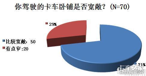 在卧铺设计是否合理这个问题上,共有70名司机给出了自己的看法,其中29%的人觉得卡车卧铺设计不够宽敞,有点窄,大部分司机认为现在的卧铺可以再放宽些,卧铺空间不够大,窄、矮、小是目前卡车卧铺主要存在的不合理地方。