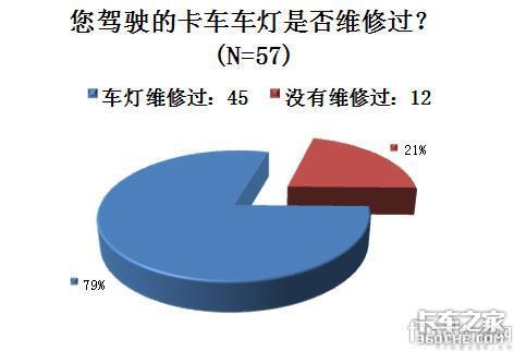 在“您驾驶的卡车车灯是否维修过”这个问题上,有57名司机给出了自己的选择,近80%的司机维修过自己的车灯。