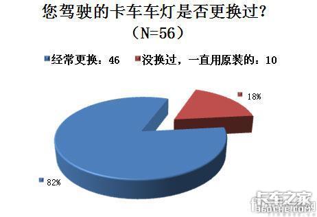在“您驾驶的卡车车灯是否更换过”这个问题上,82%的司机都更换过自己的车灯。记者在调查中了解到,更换车灯的原因有很多,一般更换大灯是由于车灯不够亮,而更换小灯的大部分原因是由于小灯泡烧毁。同时根据数据分析,没有更换灯泡的司机,大部分是购车一年之内者。