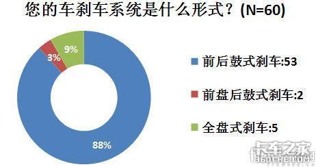 在汽车刹车系统形式的调查中,参与调查的卡车中有两辆车采用前盘后鼓式刹车系统,5辆车采用全盘式刹车系统。方得网去年的调查中,盘式刹车系统没有出现过。具体如图9-2所示。