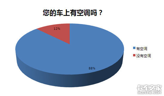 其中“您的车上有空调吗?”这一项调查,最后调查结果为204人的车上有空调,29人的车上没有安装空调。调查结果88%的卡车上均有空调,没有空调的卡车大多是老旧的卡车,或是小型的轻卡。