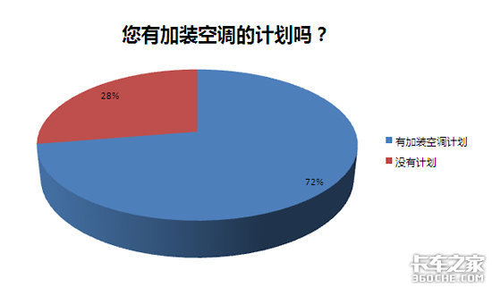 调查显示,卡车上没有空调的卡友其中有72%的卡车司机有加装空调的计划。卡车的空调安装需要考虑很多因素,像司机的运输路程、个人的心理舒适标准、卡车的动力等等,因此卡车上空调安装的解决办法还是需要具体问题具体解决,这也就需要大家互相分享、集思广益啦。