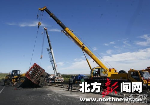 当日7时许,事发2个小时后内蒙古高速公路乌兰察布市分公司高速公路支队路政一大队的工作人员赶到了事故现场。在事故现场,记者找到了该大队的大队长孙冬煜,他正在指挥路政人员和养护工进行清障工作。孙冬煜告诉记者:“事发后,一共有40名路政人员和20名养护工到达现场进行救援,出动了6辆清障车,1辆装载机和1辆翻斗车,从7点多到15点多,救援人员工作了8个多小时,清障工作目前已经接近尾声。”