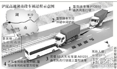 记者从湖南省怀化市政府获悉,3日上午6时45分,沪昆(上海-昆明)高速湖南怀化中方县路段(K1431+200米处)发生一起交通事故,目前已造成13人遇难,其中9人当场死亡,送医院途中死亡4人。