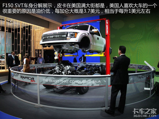 福特展台是面积最大的,相当于大众+奥迪+保时捷+宾利+宝马+MINI+起亚的总和。在福特展台有几个非常特别的展示区,其中就有F150 SVT的车身分解展示。