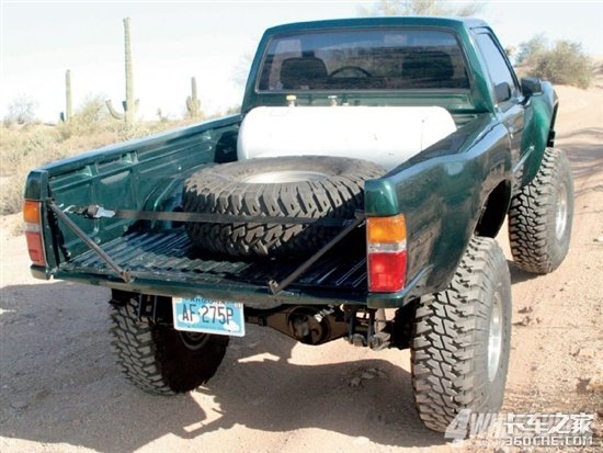 备用油箱安装在皮卡的货箱上,其容量约为150L。车身采用Hannemann玻璃纤维材料和2002款Tundra原车绿色涂装。