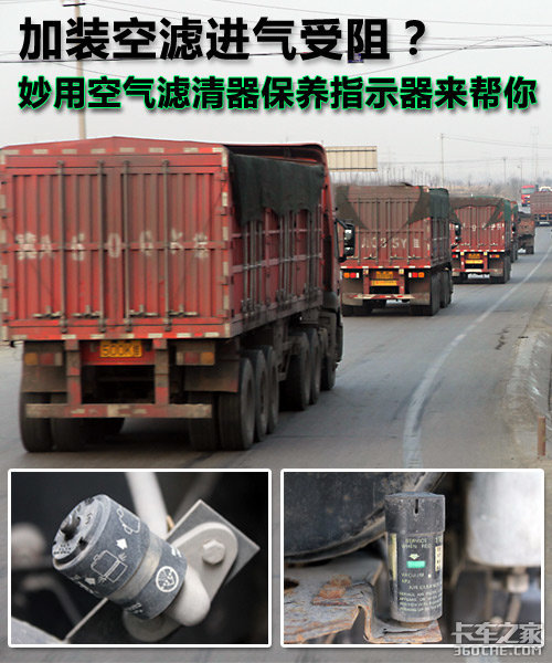 上面大图图片为解放早期卡车装配的空气滤清器保养指示器;下图左侧为现在卡车上较为流行的电子式传感器;右侧为五十铃卡车空气滤清器保养指示器。