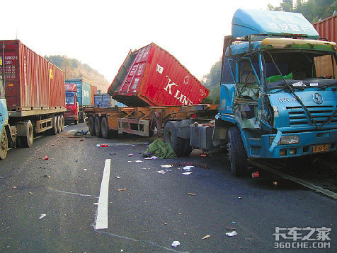 大货车的右侧车头撞在了重型半挂牵引车左侧车屁股,导致了大货车的前挡风玻璃全部掉落。就在那一瞬间,司机从驾驶室飞了出来,摔在自己的车子前方。大货车由于惯性一直往前移动,导致车子的右侧前轮恰巧碾过那名司机的身子。最后车子撞在中央护栏后才停了下来,且集装箱的箱体也掉落了下来。