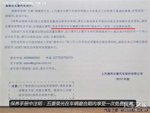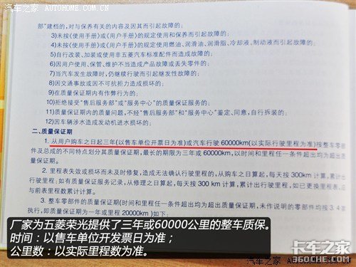 从保养手册中了解到,厂家为五菱荣光提供的质保期为三年或者60000公里(以先到者为准)。另外需要注意的是,当您购买五菱荣光三个月后,或者实际行驶超过2000-2500公里时,需要到4S店做强制首保,此项费用全免。之后的质保期内,还需要按照手册中规定的时间或里程数进行8次常规保养。?