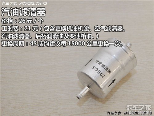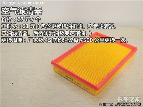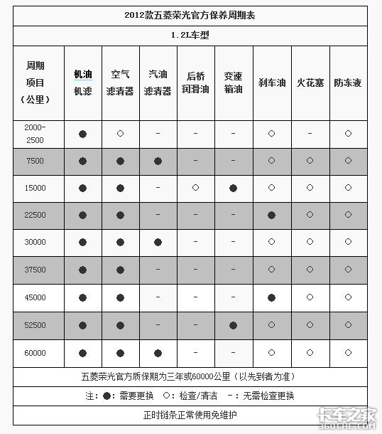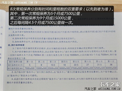 从表格中我们可以看到,机油机滤和空气滤清器在做完首保之后按5000公里更换一次,之后每隔7500公里更换一次;在质保期内汽油滤清器需要更换三次,分别是7500公里时、30000公里时和60000公里时;变速箱油需要更换两次,分别是15000公里时和52500公里时;刹车油每隔22500公里更换一次。