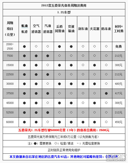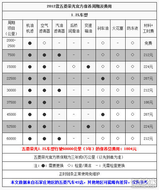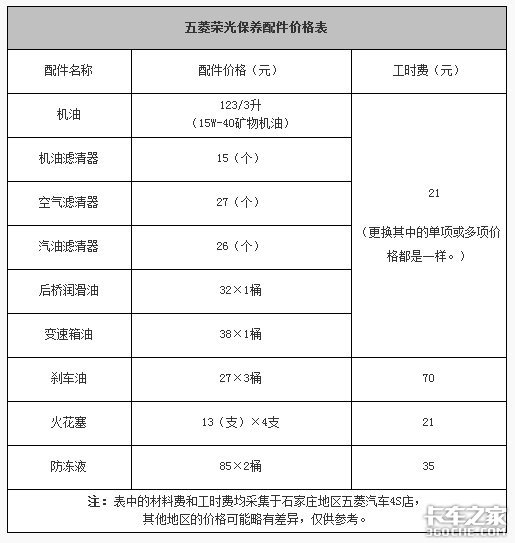 根据我们在石家庄地区五菱汽车4S店了解到的情况,4S店所执行的保养周期和官方保持一致,由于厂家未规定后桥油及火花塞等配件的更换周期,所以针对这些4S店给了客户相关的建议,如后桥油和火花塞每隔15000公里更换一次。配件价格是按照厂家指导价格收取的。由于各地区差异,工时费方面各店存在些许不同。下面的表格中,我们以石家庄地区五菱4S店的工时费价格,计算出了五菱荣光从新车到行驶60000公里时,所需要的具体费用。
