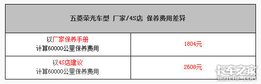以上是按照官方保养项目计算出的费用,我们看到按照官方保养项目计算,五菱荣光的一次小保养价格为186元,60000公里的总保养费用为1804元。这里需要注意的是,官方保养中并未涉及到后桥润滑油、火花塞和防冻液的更换。这样看来虽然官方保养的价格低,但安排并不合理。
