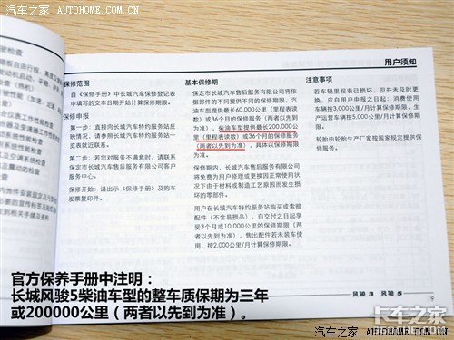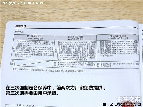 从官方保养手册上我们可以得知,厂家为长城风骏5柴油版提供的质保周期为三年或20万公里(以先到期限者为准)。厂家为风骏5柴油版车型提供两次免费保养,分别在行驶1000-1500公里和4000-5000公里时到长城汽车特约服务站进行;从第三次保养开始,每隔6000公里保养一次。
