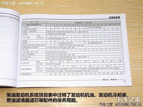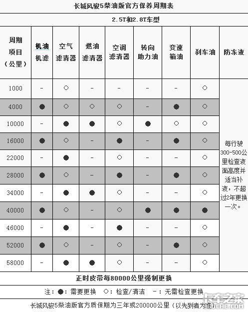 从表格中我们可以看到,长城风骏5柴油版的机油机滤和变速箱油是4000公里时第一次更换,以后每12000公里更换一次;空气滤清器每隔12000公里更换一次;燃油滤清器每隔24000公里更换一次;转向助力油在10000公里时第一次更换,以后每隔30000公里更换一次;刹车油每隔40000公里更换一次。
