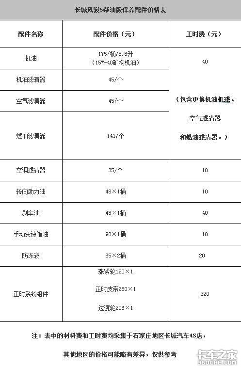 根据我们在石家庄地区长城汽车4S店了解到的情况,4S店所执行的保养周期和官方是一致的,在下面的表格中,我们计算出风骏5柴油版从新车到行驶60000公里时,所需要的具体费用。