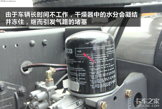 在启动车辆之前,应检查干燥器中凝水是否冻住,必要时要用火烤解冻,以免让整个气路发生堵塞,倘若气路堵塞,检查刹车是否回位不畅,避免刹车抱死。