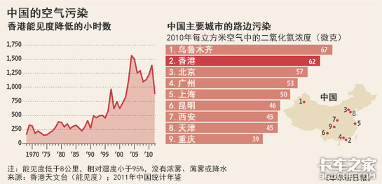 作为对市民抱怨程度不断提高的回应,香港把矛头指向老旧卡车,称80%的路边空气污染是由这些卡车制造的。和中国大陆不一样,香港不要求老旧柴油卡车在达到一定年限后报废。难怪在香港的马路上,除了那些有专门司机驾驶的捷豹(Jaguar)和宾利(Bentley)等豪车,还有大量冒黑烟的老旧卡车。