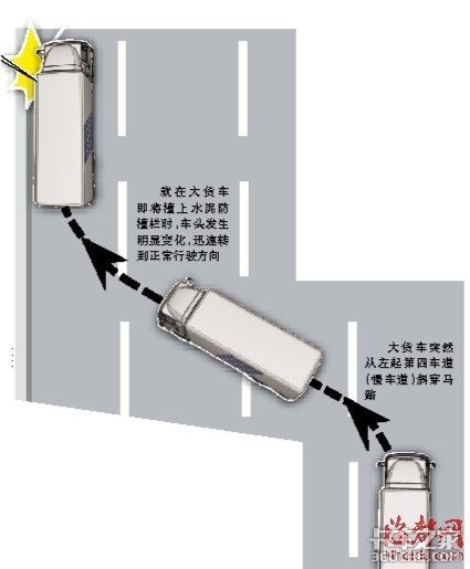 ● 监控:大货车撞上护栏前,有修正迹象