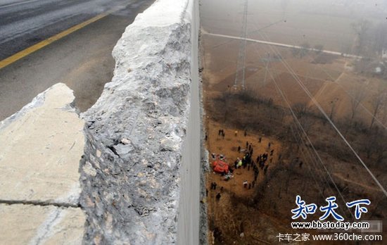 采访中,有村民说,在这辆半挂车驾驶室跌落前,就有车辆不停的鸣笛,估计是有人提醒这个开车的司机。图为大货车车头将高架桥护栏撞出一个缺口后,车头坠落到了下方的街子村。