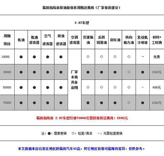 根据我们在石家庄地区福田汽车4S店了解到的情况,4S店在保养周期上会根据当地的实际用车情况来制定,其中一些配件的保养周期会与官方手册上所建议的有所出入。在下面的表格中,我们按厂家规定的配件保养周期和当地4S店建议的保养周期,分别计算出了福田拓陆者2.8T柴油版所需要的具体保养费用。
