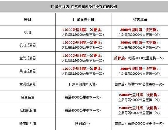 通过上表的情况我们可以发现,在机油、机油滤清器、空气滤清器和柴油滤清器的更换周期上,厂家建议在车辆行驶到10000公里时第一次更换;4S店则建议在3000公里时第一次更换,之后均建议每隔20000公里更换一次。在变速箱油和后桥润滑油的更换周期上,厂家建议每隔40000公里更换一次;4S店则建议在23000时第一次更换,之后也将同为每隔40000公里更换一次。在空调滤清器和转向助力油方面,厂家给出的建议分别为未作具体说明和随时加注;而4S店的建议则更为具体,分别为首保后每隔20000公里和每隔40000公里更换一次。
