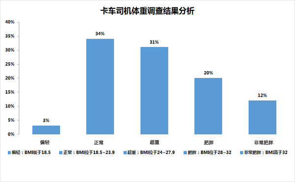 来卡车之家App【卡车之家 原创】卡车司机由于职业的特殊性,常年在外奔波,连基本的一日三餐和睡眠都无法保证,更是忽略了对自身健康的关注。对此卡车之家做了一个小小的调查活动,征集各位卡车司机的身高体重,并进行粗略的健康分析。结果显示,多数卡车司机体型偏重,存在一定的健康隐患。