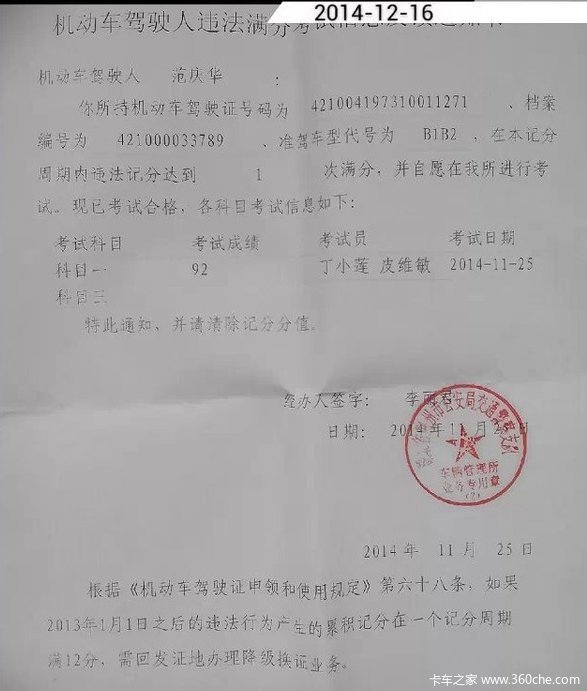 上午九点刚到可口可乐门口,被武汉经济开区巡逻交警拦下,被带到“荣达”停车场过磅。结果显示超重两吨,交警开具超重罚单,罚款200扣3分。由于卡友之前累计已经被扣了10分,再扣累计达到了13分,达到降级标准。不到中午11点半就被登记到了网上。驾照降级已成定局。