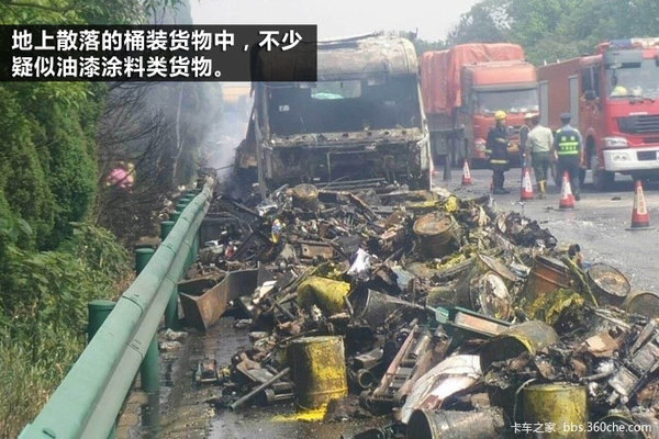 装载货物种类比较繁杂。但是从图片上我们看出,燃烧后的残留物中有不少带有颜色的桶装货物,是否是油漆我们不敢肯定,但是应该是涂料类的东西。通常这类货物在零担运输中经常能见到夹带的,这类物品是易燃危险品,属于危险货物分类第三类,普通货物运输是严禁装载的。一旦发生自燃事故,即便是你购买了车辆自燃险,保险公司也是会拒赔的,在装货时应当拒绝装载夹带危险货物。