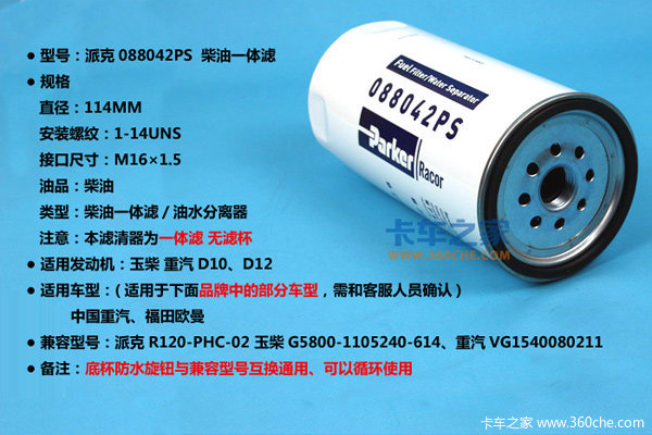 热卖产品推荐2:派克088042PS 10微米柴油一体滤 玉柴 重汽D12通用(不含放水旋钮)