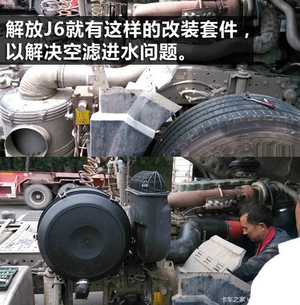 由于车辆设计的原因我们可以通过一些改装来实现,例如解放J6就有改装套件来解决这个问题。没有套件的就需要卡友们用自己的大智慧来解决了,比如给空滤穿个外衣等。如果单纯只是螺旋进气罩装反的情况,我们可以将它正确安装就可以解决遇到雨天车就无力的情况了。