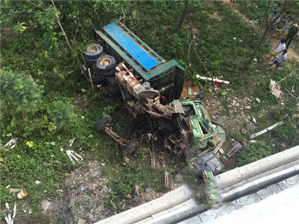 来卡车之家App【卡车之家 原创】2015年9月10日上午7点左右,海口琼州大桥琼山大道往国兴大道方向一辆挂着广西牌照的重型卡车,在行驶过程中突然往非机动车道上冲撞过去,并将一辆正在行驶中的电动车辗压过去后撞破护拦掉下大桥。事故造成被辗压的电动车司机身亡。