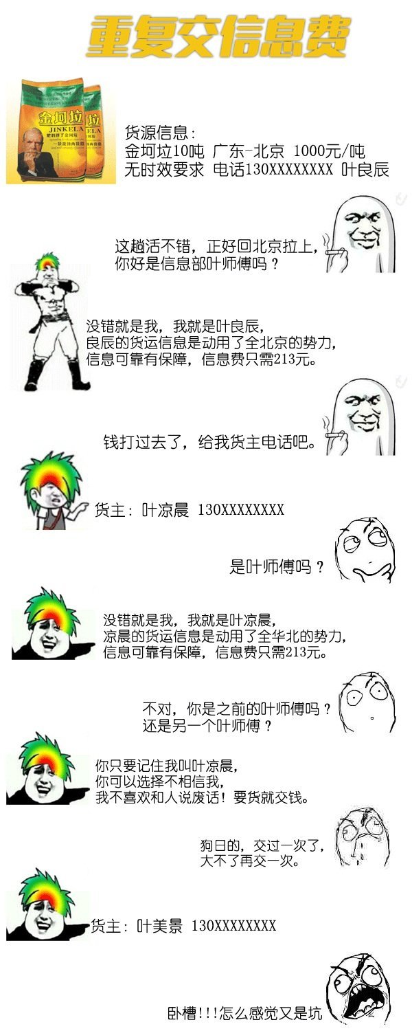 一单货到自己车上,有时会经手几个信息部,对于第一次合作的货站,没见到货物前不要轻易交信息费。