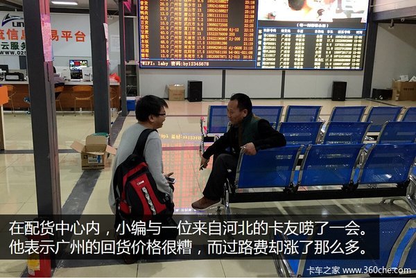 在配货中心内,小编与一位来自河南的卡友唠了一会。他说这里早上的确有早餐送,包括豆浆油条加肠粉。不过聊到配货,他就显得有些无奈了,虽然在这里能找到回去的货,不过价格很难让人满意,运费基本只够抵消路上的花费,特别是计重收费后,各省的高速都涨了价,最厉害的是湖北,过路费比以前多了一倍。