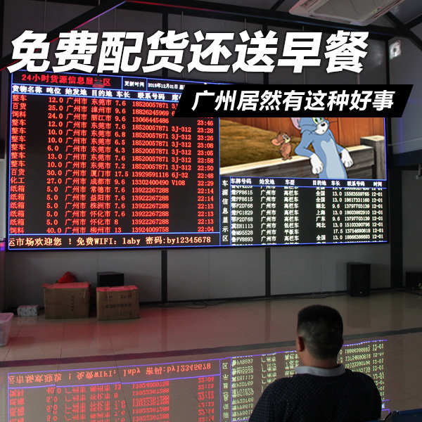 大屏幕上滚动的货源信息和林安完全对接,每分钟更新一次,在林安能看到的信息这里也全部都有。右上方的屏幕一直在播放电影,卡友们找货的同时也能消遣一下。