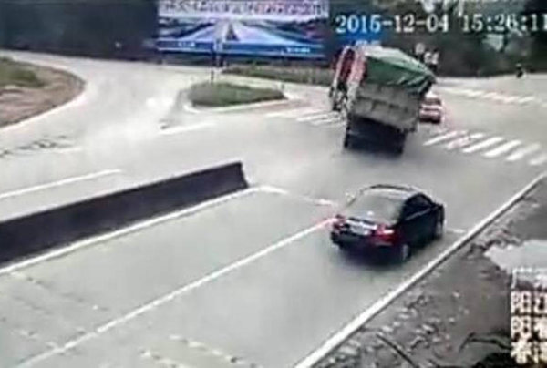 据报道,粤B牌商务小车临时变道拐弯,大货车车速较快,被逼拐弯导致车辆侧翻,压住粤B牌商务小车。