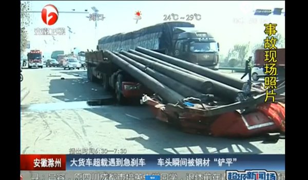 原因:因货物固定不牢,司机突然急刹车,后方的钢梁直接捅掉了货车驾驶室。