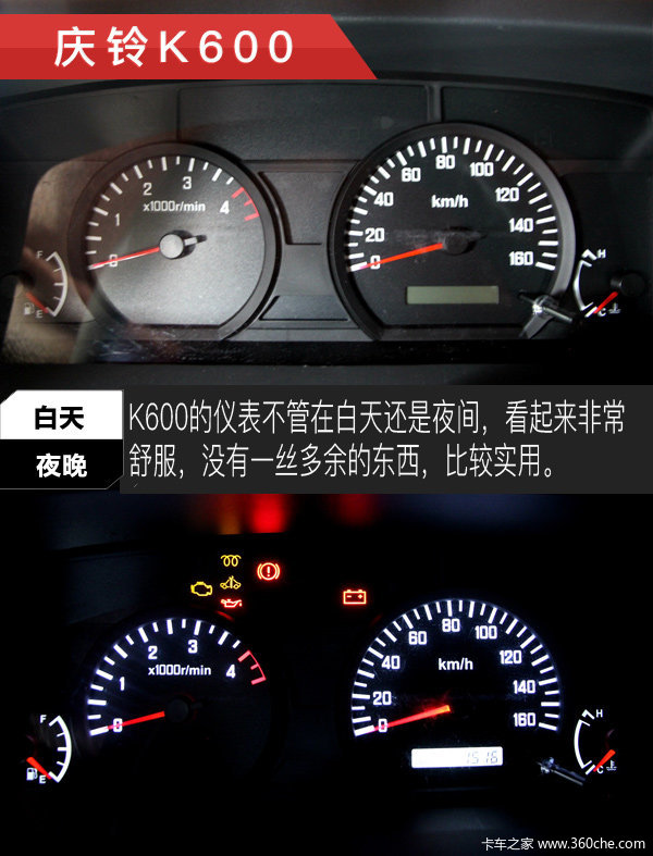 东风凯普特N300仪表盘总体感觉还不错,其中不难发现和凯锐800也有几分相像,只不过N300的仪表盘右侧上方多了一个真空表。不过夜间时红色的背光让旁边表盘刻度红色线条看起来比较吃力。如果整体和凯锐800相比视觉上稍微要差一点,并没有凯锐800那么简洁。